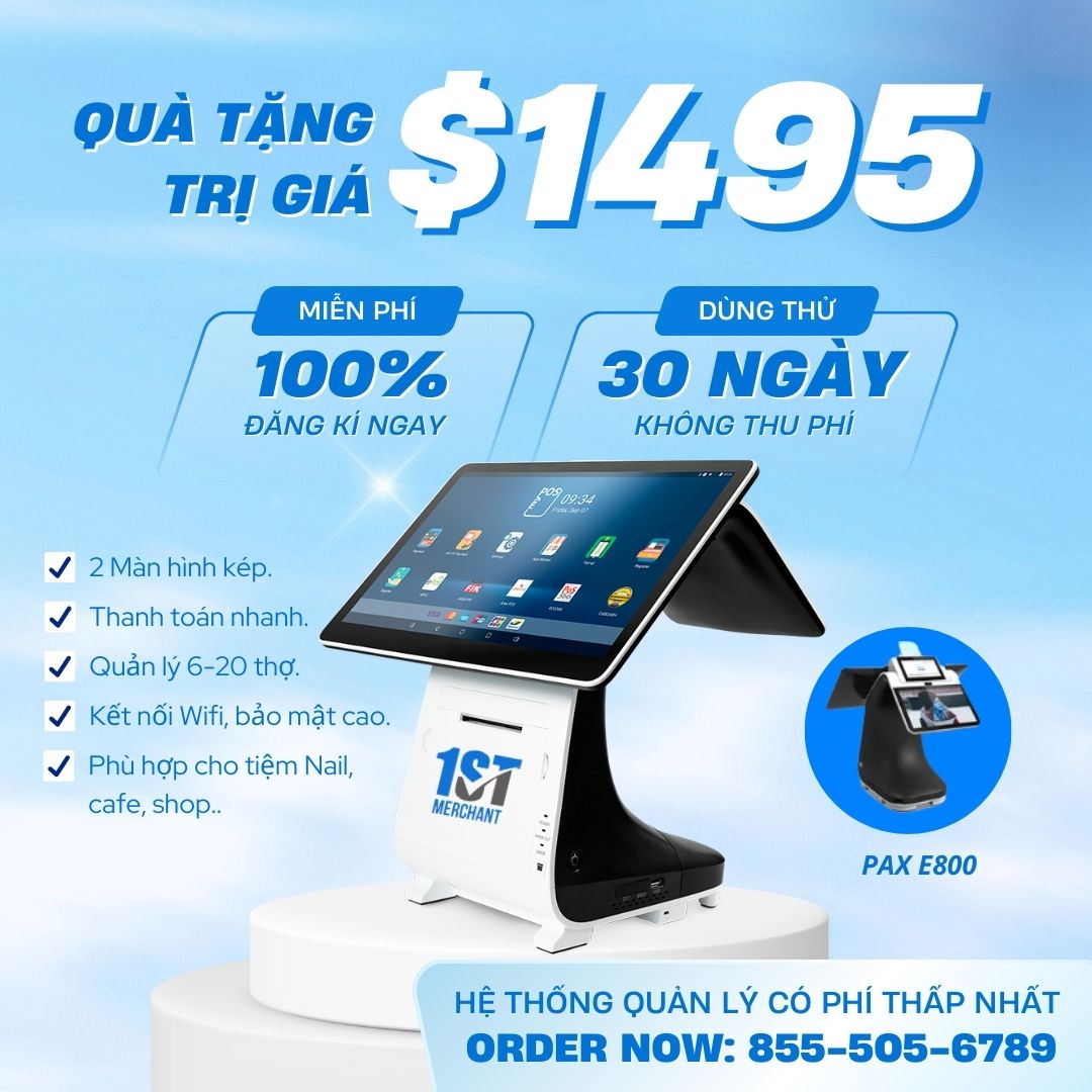 Với 1ST Merchant, bạn có thể bắt đầu bằng một giải pháp gọn gàng: PAX E800 – 2 màn hình kép + chính sách ưu đãi để bạn thử trước khi quyết định.